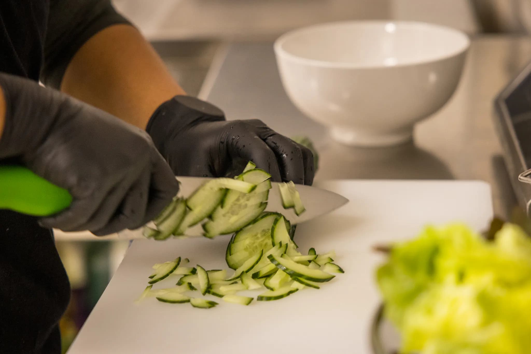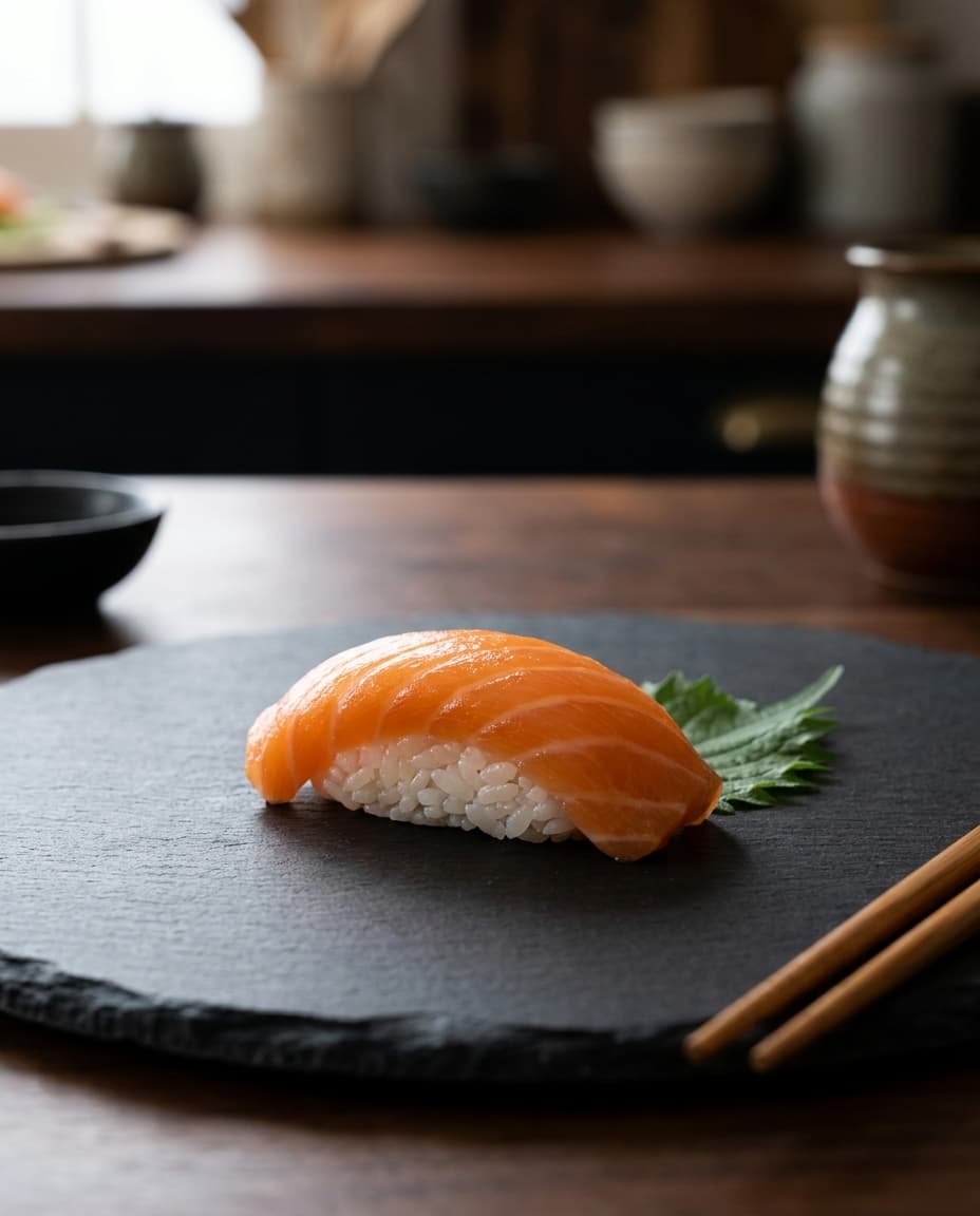 Riz japonais cuit au quotidien, couteaux forgés, 20 ans de lame au comptoir. Notre chef Vincent taille, presse et roule chaque pièce devant vous.